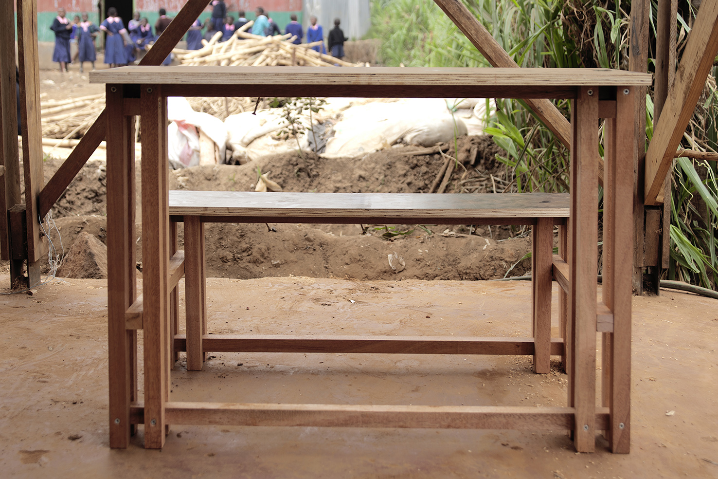 The construction system is based on a single one-meter-long box-sectioned lath of local wood similar to mogany, measuring 30 by 30 millimeters. Ordered from a carpentery shop in Nairobi, it is assembled like Lego to make many different types of furniture, which are combined with plywood surfaces painted with a slate effect. The laths are exploited to the maximum, and the screw halls are very carrefully preparred “i created a primitive error-proof assembly line” says Francesco “this system is ideal to make benches of three different sizes, according to the student age. Once a semplification factor had been introduced, and a rapid, repetitive production method established, everything went smoothly”.