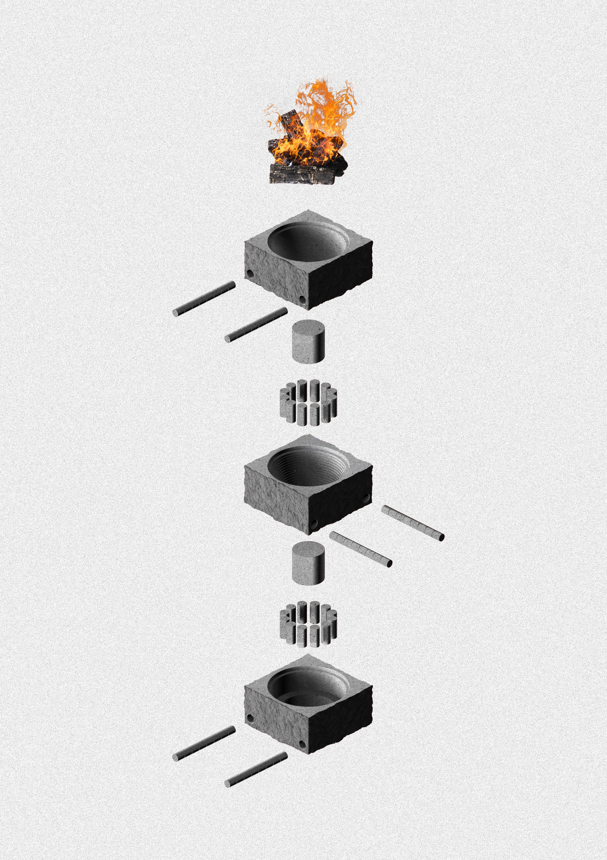 The holes, the result of core drilling, become the housing for the “Innocenti” scaffolding standard pipes, that serve as a functional element: the brazier is, in fact, designed to be transported by human traction alone in a direct reference to the collective rituals and to the physical effort involved in the extraction processes.