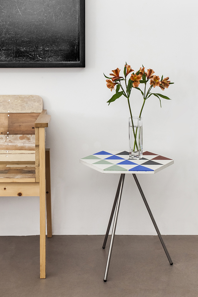The result is a table for indoors and outdoor whose hexagonal shape offers the possibilty to reproduce a “raised floor” combining as many pieces as desired.